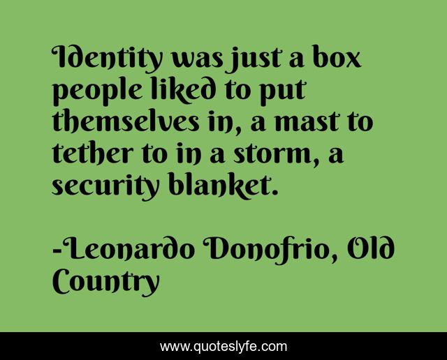 This page presents the quote "Identity was just a box people liked to put themselves in, a mast to tether to in a storm, a security blanket.". Author of this quote is Leonardo Donofrio, Old Country. This quote is about definition, security-blanket, identification, storm, identity-crisis, define-yourself, security, identity,.