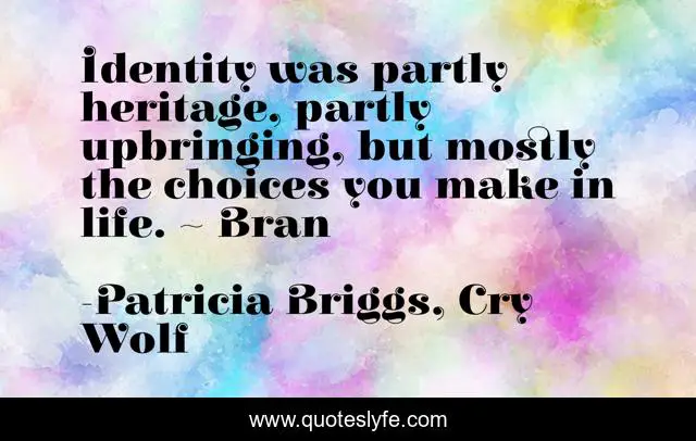 This page presents the quote "Identity was partly heritage, partly upbringing, but mostly the choices you make in life. ~ Bran". Author of this quote is Patricia Briggs, Cry Wolf. This quote is about choices, upbringing, identity, heritage,.