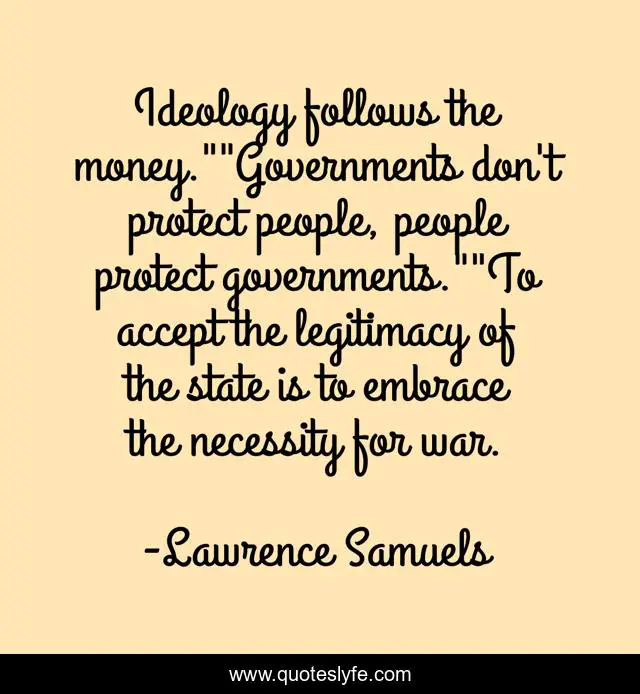 This page presents the quote "Ideology follows the money.""Governments don't protect people, people protect governments.""To accept the legitimacy of the state is to embrace the necessity for war.". Author of this quote is Lawrence Samuels. This quote is about politics, chaos-theory, complexity-science, human-action, economics,.
