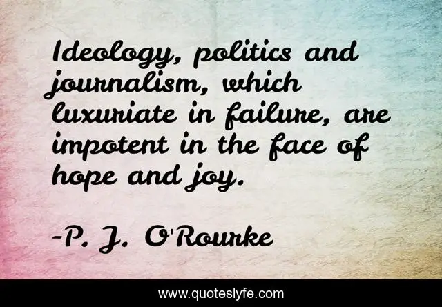 This page presents the quote "Ideology, politics and journalism, which luxuriate in failure, are impotent in the face of hope and joy.". Author of this quote is P. J. O'Rourke. This quote is about politics, hope, joy,.