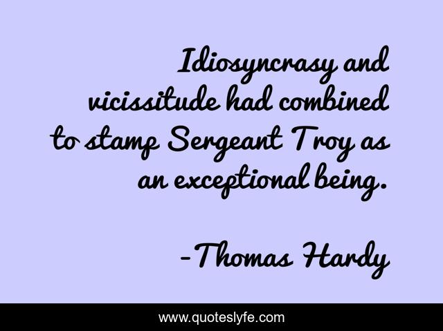 This page presents the quote "Idiosyncrasy and vicissitude had combined to stamp Sergeant Troy as an exceptional being.". Author of this quote is Thomas Hardy. This quote is about thomas-hardy, character, far-from-the-madding-crowd, sergeant-troy,.