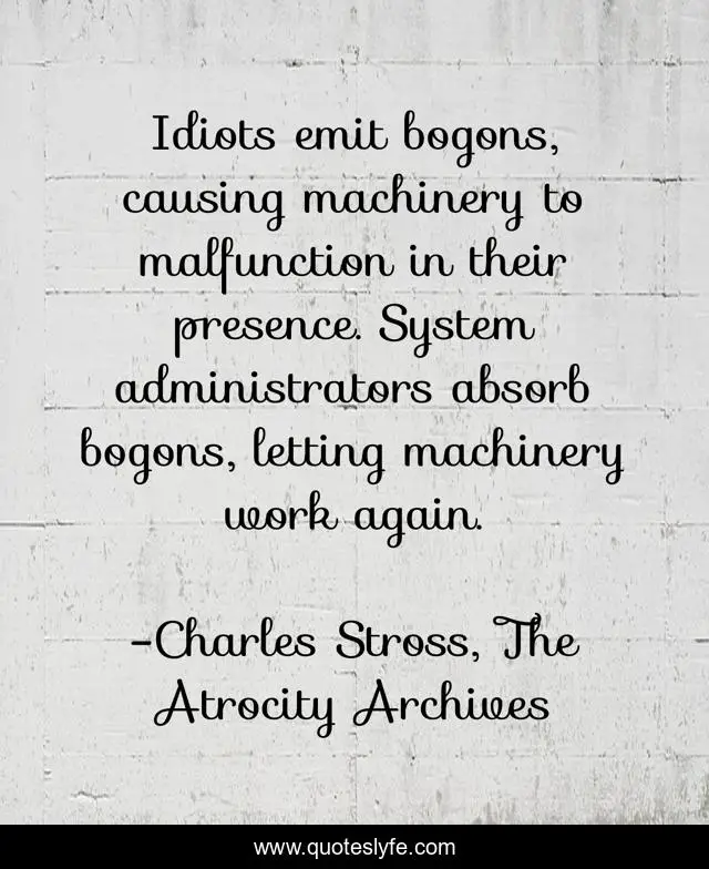 "Charles Stross, The Atrocity Archives Quotes." Quoteslyfe.com, 2025. Fri. 05 Dec. 2025. <https://www.quoteslyfe.com/quote/Idiots-emit-bogons-causing-machinery-to-malfunction-55529>.