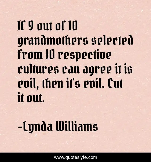 This page presents the quote "If 9 out of 10 grandmothers selected from 10 respective cultures can agree it is evil, then it's evil. Cut it out.". Author of this quote is Lynda Williams. .