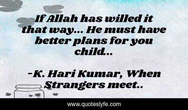 This page presents the quote "If Allah has willed it that way... He must have better plans for you child...". Author of this quote is K. Hari Kumar, When Strangers meet... This quote is about faith, gurgaon, chennai, delhi, indian-culture, allah, k-hari-kumar, when-stranger-meet, indian-fiction,.