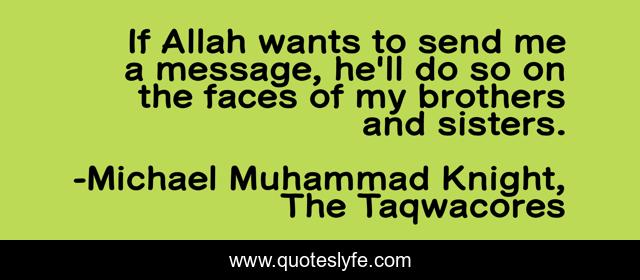 This page presents the quote "If Allah wants to send me a message, he'll do so on the faces of my brothers and sisters.". Author of this quote is Michael Muhammad Knight, The Taqwacores. This quote is about muslim, humanism, islamic, humanist, inspirational, enthusiasm, religious, islam,.