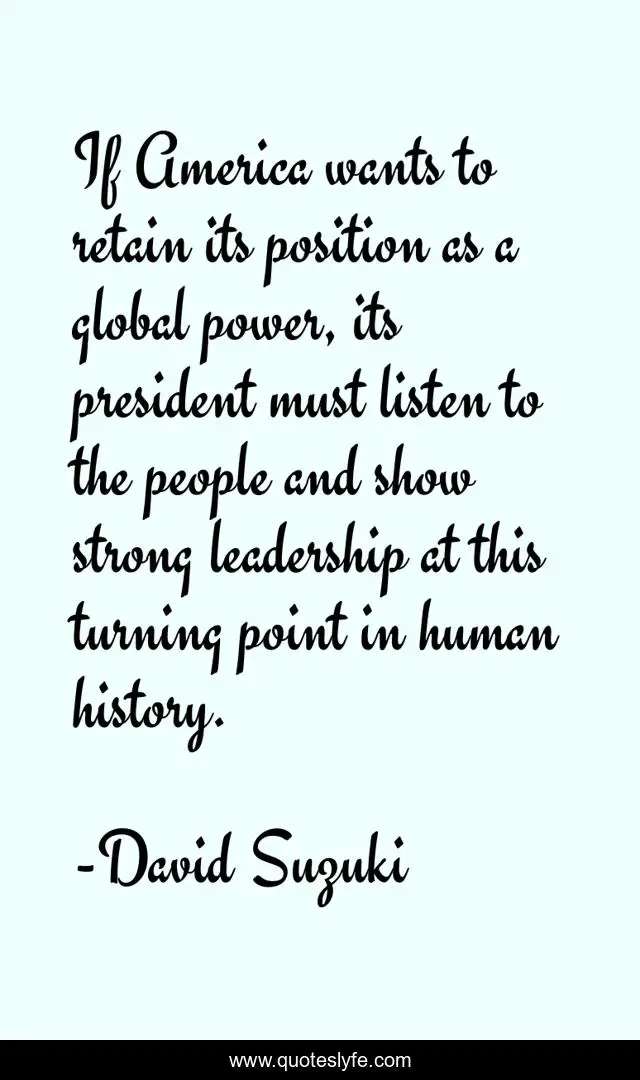 This page presents the quote "If America wants to retain its position as a global power, its president must listen to the people and show strong leadership at this turning point in human history.". Author of this quote is David Suzuki. This quote is about strong, power, history,.