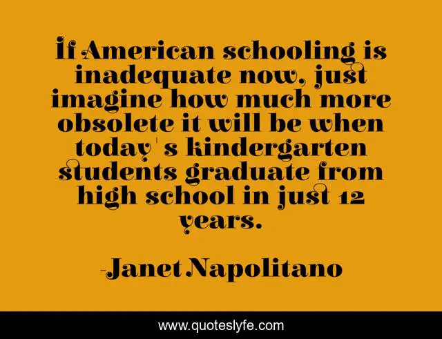 This page presents the quote "If American schooling is inadequate now, just imagine how much more obsolete it will be when today's kindergarten students graduate from high school in just 12 years.". Author of this quote is Janet Napolitano. This quote is about school, american, today,.