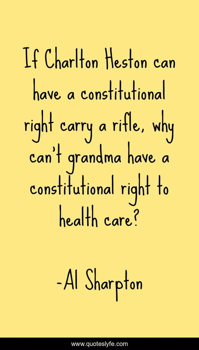 This page presents the quote "If Charlton Heston can have a constitutional right carry a rifle, why can't grandma have a constitutional right to health care?". Author of this quote is Al Sharpton. This quote is about right, why, care,.