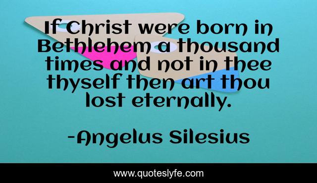This page presents the quote "If Christ were born in Bethlehem a thousand times and not in thee thyself then art thou lost eternally.". Author of this quote is Angelus Silesius. This quote is about religion, christianity, self-knowledge,.