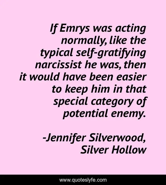This page presents the quote "If Emrys was acting normally, like the typical self-gratifying narcissist he was, then it would have been easier to keep him in that special category of potential enemy.". Author of this quote is Jennifer Silverwood, Silver Hollow. This quote is about chick-lit, paranormal-romance-faeries, fantasy-fiction,.