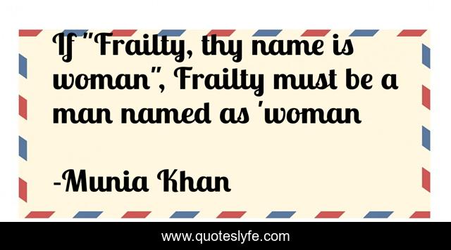 This page presents the quote "If "Frailty, thy name is woman", Frailty must be a man named as 'woman". Author of this quote is Munia Khan. This quote is about frailty, woman, shakespearean-insult, man,.