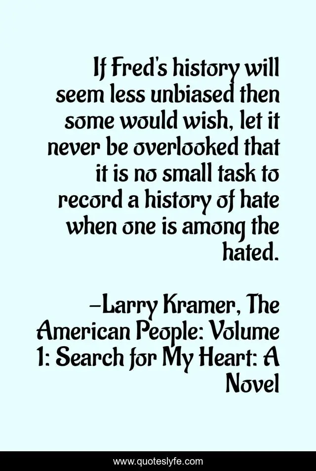This page presents the quote "If Fred's history will seem less unbiased then some would wish, let it never be overlooked that it is no small task to record a history of hate when one is among the hated.". Author of this quote is Larry Kramer, The American People: Volume 1: Search for My Heart: A Novel. .