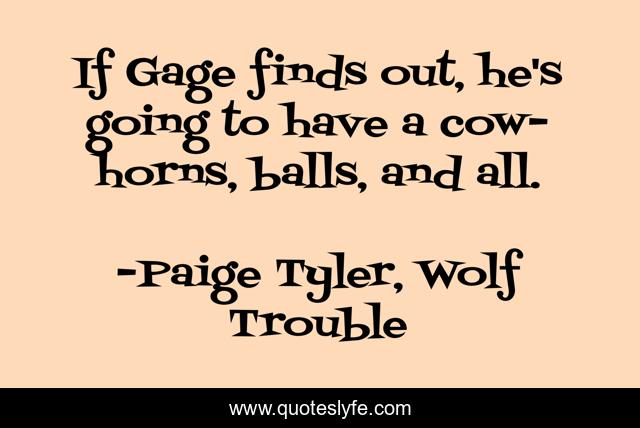 This page presents the quote "If Gage finds out, he's going to have a cow-horns, balls, and all.". Author of this quote is Paige Tyler, Wolf Trouble. This quote is about shifters-romance, romantic-suspense,.