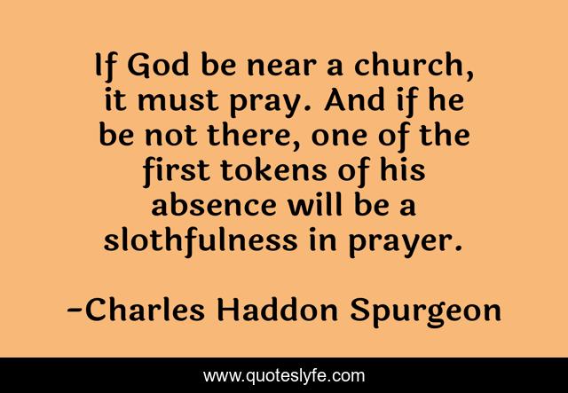 This page presents the quote "If God be near a church, it must pray. And if he be not there, one of the first tokens of his absence will be a slothfulness in prayer.". Author of this quote is Charles Haddon Spurgeon. This quote is about church, prayer,.