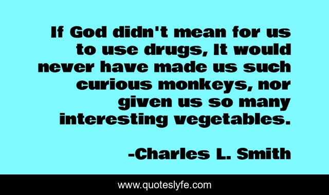 This page presents the quote "If God didn't mean for us to use drugs, It would never have made us such curious monkeys, nor given us so many interesting vegetables.". Author of this quote is Charles L. Smith. This quote is about drugs, god, vegetables,.