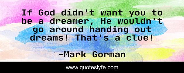 This page presents the quote "If God didn't want you to be a dreamer, He wouldn't go around handing out dreams! That's a clue!". Author of this quote is Mark Gorman. This quote is about god, goals, inspirational, mark-gorman, enthusiasm, dreams,.