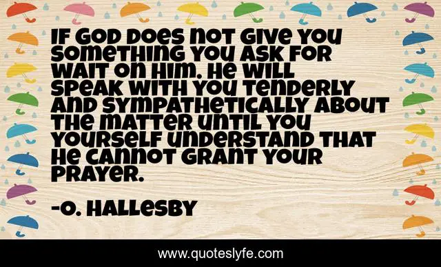 This page presents the quote "If God does not give you something you ask for wait on Him. He will speak with you tenderly and sympathetically about the matter until you yourself understand that He cannot grant your prayer.". Author of this quote is O. Hallesby. .