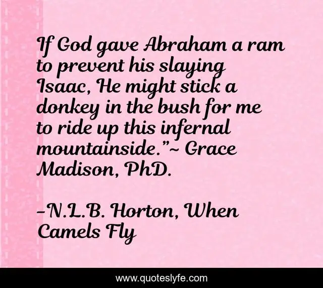 This page presents the quote "If God gave Abraham a ram to prevent his slaying Isaac, He might stick a donkey in the bush for me to ride up this infernal mountainside.”~ Grace Madison, PhD.". Author of this quote is N.L.B. Horton, When Camels Fly. This quote is about humorous, christian, suspense,.