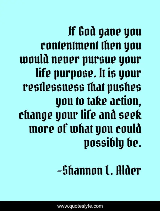 This page presents the quote "If God gave you contentment then you would never pursue your life purpose. It is your restlessness that pushes you to take action, change your life and seek more of what you could possibly be.". Author of this quote is Shannon L. Alder. This quote is about needs, contentment, misery,.