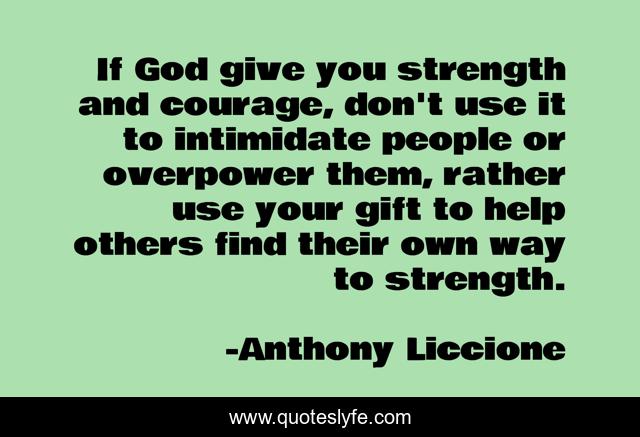 This page presents the quote "If God give you strength and courage, don't use it to intimidate people or overpower them, rather use your gift to help others find their own way to strength.". Author of this quote is Anthony Liccione. This quote is about change-for-the-better, way-to-life, gift, people, intimidate, god, support, assist, serve,.