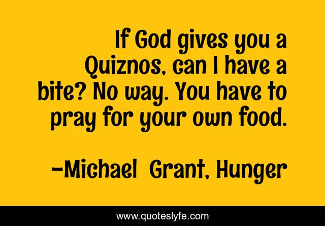 This page presents the quote "If God gives you a Quiznos, can I have a bite? No way. You have to pray for your own food.". Author of this quote is Michael Grant, Hunger. This quote is about food, gone, michael-grant, hunger,.