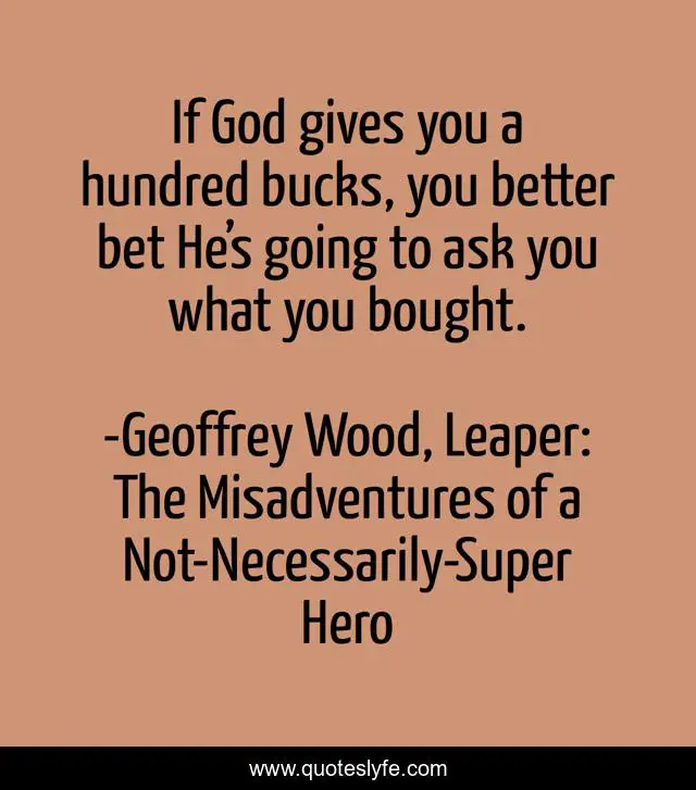 This page presents the quote "If God gives you a hundred bucks, you better bet He’s going to ask you what you bought.". Author of this quote is Geoffrey Wood, Leaper: The Misadventures of a Not-Necessarily-Super Hero. This quote is about leaper, comedy, god, christianity, religion, christian-fiction,.
