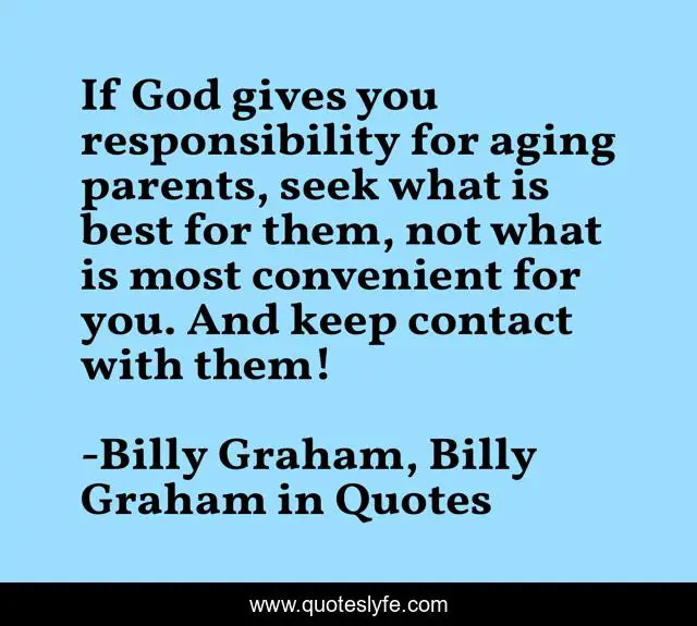 This page presents the quote "If God gives you responsibility for aging parents, seek what is best for them, not what is most convenient for you. And keep contact with them!". Author of this quote is Billy Graham, Billy Graham in Quotes. This quote is about parents, billy-graham,.