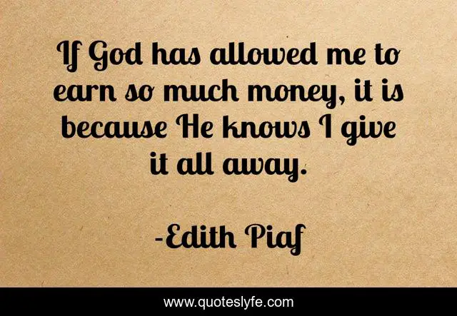 This page presents the quote "If God has allowed me to earn so much money, it is because He knows I give it all away.". Author of this quote is Edith Piaf. This quote is about me, god, earn,.