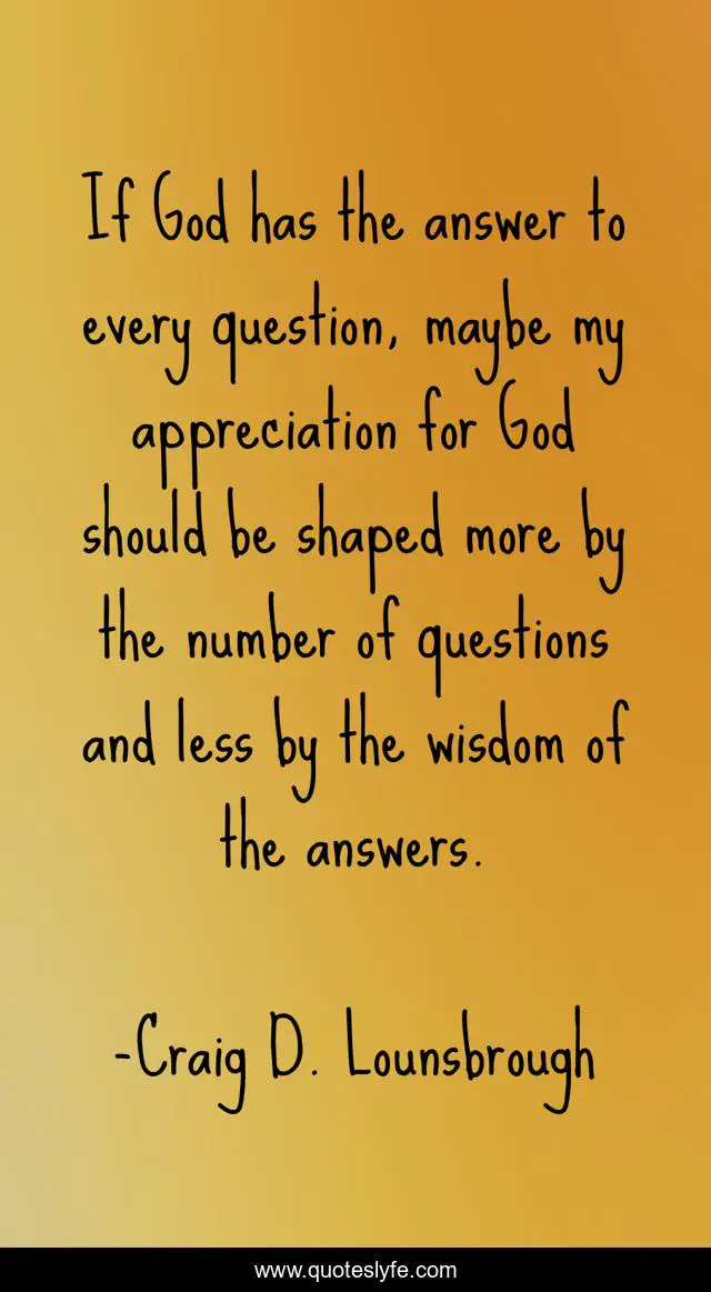 This page presents the quote "If God has the answer to every question, maybe my appreciation for God should be shaped more by the number of questions and less by the wisdom of the answers.". Author of this quote is Craig D. Lounsbrough. This quote is about holiday, death, christian, god, sacrifice, cross, answers, jesus, questions,.