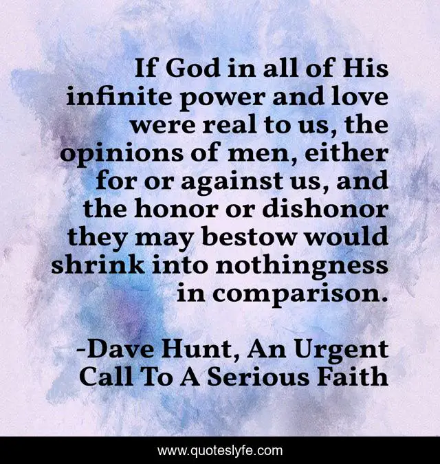 This page presents the quote "If God in all of His infinite power and love were real to us, the opinions of men, either for or against us, and the honor or dishonor they may bestow would shrink into nothingness in comparison.". Author of this quote is Dave Hunt, An Urgent Call To A Serious Faith. This quote is about popularity, humanity,.