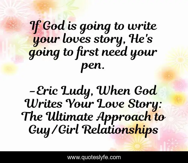 This page presents the quote "If God is going to write your loves story, He's going to first need your pen.". Author of this quote is Eric Ludy, When God Writes Your Love Story: The Ultimate Approach to Guy/Girl Relationships. This quote is about love, christian-dating, marriage, affection, trusting-god,.