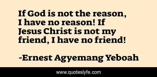 This page presents the quote "If God is not the reason, I have no reason! If Jesus Christ is not my friend, I have no friend!". Author of this quote is Ernest Agyemang Yeboah. This quote is about christian-walk, doubt, hate,.
