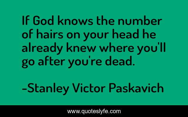 This page presents the quote "If God knows the number of hairs on your head he already knew where you'll go after you're dead.". Author of this quote is Stanley Victor Paskavich. This quote is about judgement, afterlife, life,.