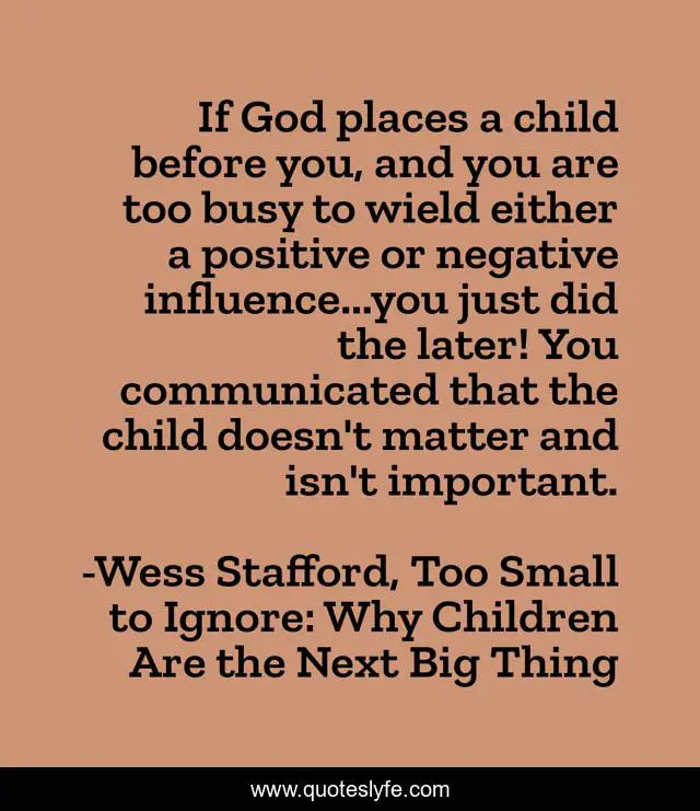 This page presents the quote "If God places a child before you, and you are too busy to wield either a positive or negative influence...you just did the later! You communicated that the child doesn't matter and isn't important.". Author of this quote is Wess Stafford, Too Small to Ignore: Why Children Are the Next Big Thing. This quote is about caring, negative-influence, busy, valuing-children, listening, postive-influence, children,.