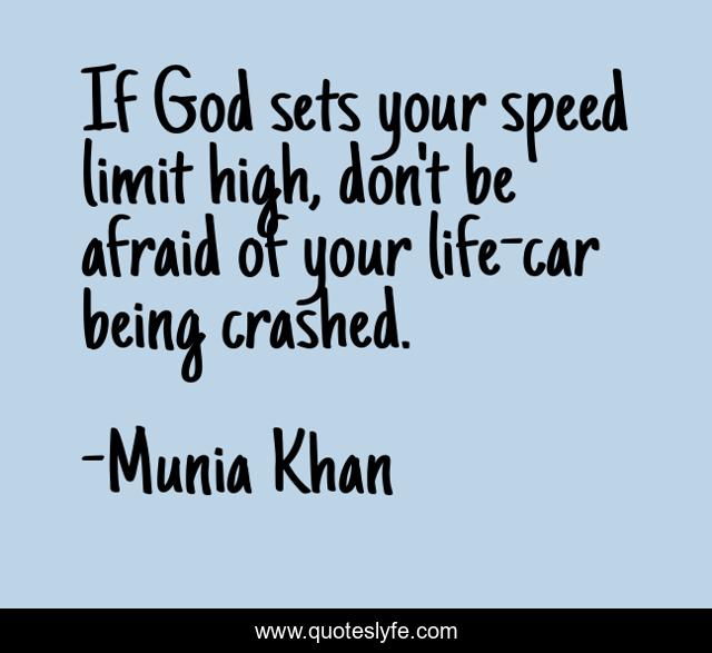 This page presents the quote "If God sets your speed limit high, don't be afraid of your life-car being crashed.". Author of this quote is Munia Khan. This quote is about life, afraid, crash, destiny, fate, crashed, cars, god, spiritual,.