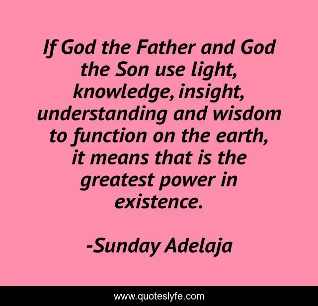This page presents the quote "If God the Father and God the Son use light, knowledge, insight, understanding and wisdom to function on the earth, it means that is the greatest power in existence.". Author of this quote is Sunday Adelaja. This quote is about knowledge, power, god, insight, understanding, light, earth, wisdom,.