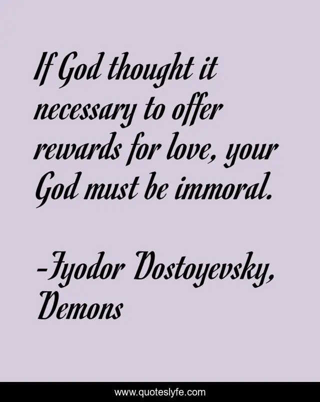 This page presents the quote "If God thought it necessary to offer rewards for love, your God must be immoral.". Author of this quote is Fyodor Dostoyevsky, Demons. This quote is about dostoyevski, love, demons, affection, god,.