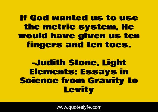 This page presents the quote "If God wanted us to use the metric system, He would have given us ten fingers and ten toes.". Author of this quote is Judith Stone, Light Elements: Essays in Science from Gravity to Levity. This quote is about comedy, metric-system,.