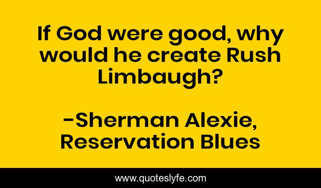 This page presents the quote "If God were good, why would he create Rush Limbaugh?". Author of this quote is Sherman Alexie, Reservation Blues. This quote is about good, god, rush-limbaugh, evil, religion, goodness,.