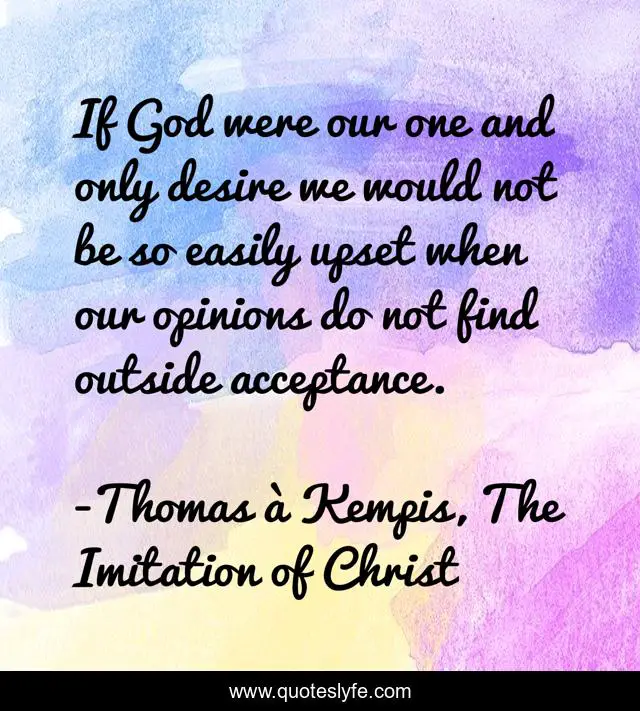 This page presents the quote "If God were our one and only desire we would not be so easily upset when our opinions do not find outside acceptance.". Author of this quote is Thomas à Kempis, The Imitation of Christ. This quote is about opinions, acceptance, christian, christ,.