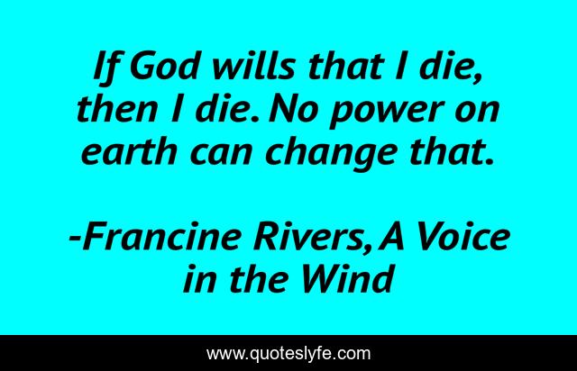 This page presents the quote "If God wills that I die, then I die. No power on earth can change that.". Author of this quote is Francine Rivers, A Voice in the Wind. This quote is about die, power, earth,.