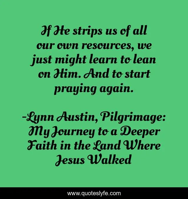 This page presents the quote "If He strips us of all our own resources, we just might learn to lean on Him. And to start praying again.". Author of this quote is Lynn Austin, Pilgrimage: My Journey to a Deeper Faith in the Land Where Jesus Walked. .