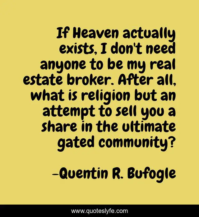 This page presents the quote "If Heaven actually exists, I don't need anyone to be my real estate broker. After all, what is religion but an attempt to sell you a share in the ultimate gated community?". Author of this quote is Quentin R. Bufogle. This quote is about atheism, religion,.