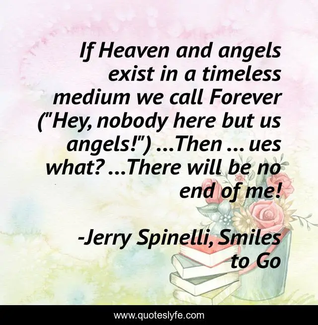 This page presents the quote "If Heaven and angels exist in a timeless medium we call Forever ("Hey, nobody here but us angels!") ...Then ... ues what? ...There will be no end of me!". Author of this quote is Jerry Spinelli, Smiles to Go. .