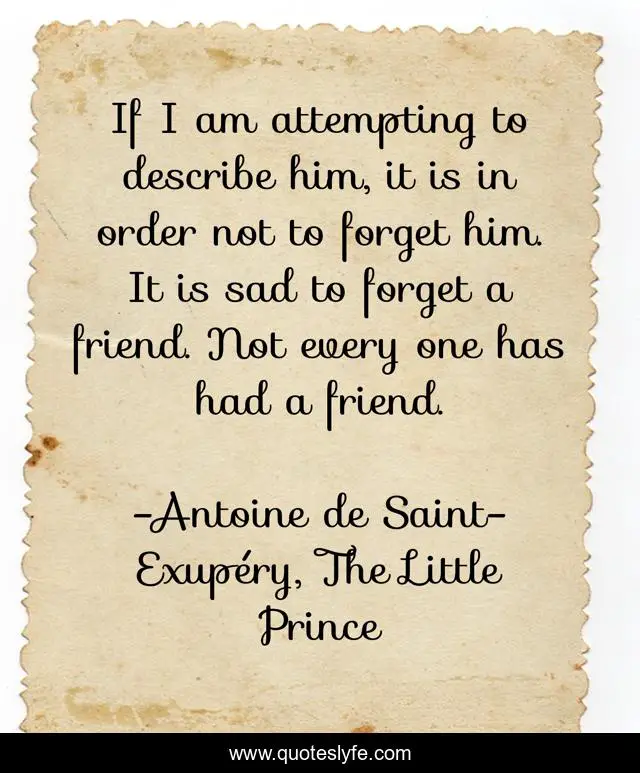 This page presents the quote "If I am attempting to describe him, it is in order not to forget him. It is sad to forget a friend. Not every one has had a friend.". Author of this quote is Antoine de Saint-Exupéry, The Little Prince. .