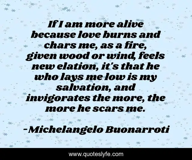This page presents the quote "If I am more alive because love burns and chars me, as a fire, given wood or wind, feels new elation, it's that he who lays me low is my salvation, and invigorates the more, the more he scars me.". Author of this quote is Michelangelo Buonarroti. This quote is about love, poetry, affection,.