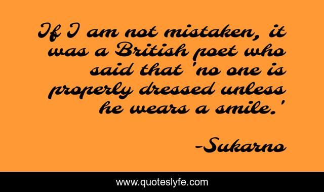 This page presents the quote "If I am not mistaken, it was a British poet who said that 'no one is properly dressed unless he wears a smile.'". Author of this quote is Sukarno. This quote is about dressed, said,.