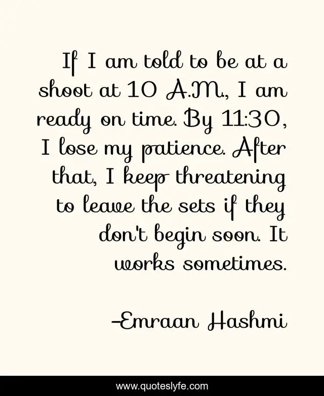This page presents the quote "If I am told to be at a shoot at 10 A.M., I am ready on time. By 11:30, I lose my patience. After that, I keep threatening to leave the sets if they don't begin soon. It works sometimes.". Author of this quote is Emraan Hashmi. This quote is about ready, time,.