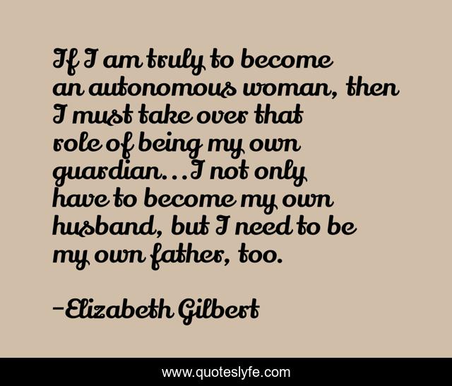 This page presents the quote "If I am truly to become an autonomous woman, then I must take over that role of being my own guardian...I not only have to become my own husband, but I need to be my own father, too.". Author of this quote is Elizabeth Gilbert. This quote is about enthusiasm, inspirational,.