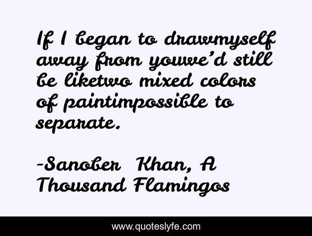 This page presents the quote "If I began to drawmyself away from youwe’d still be liketwo mixed colors of paintimpossible to separate.". Author of this quote is Sanober Khan, A Thousand Flamingos. This quote is about relationships, poets, one-and-only, love, love-poetry, indian-authors, soulmates, poetry, poets-and-poetry,.